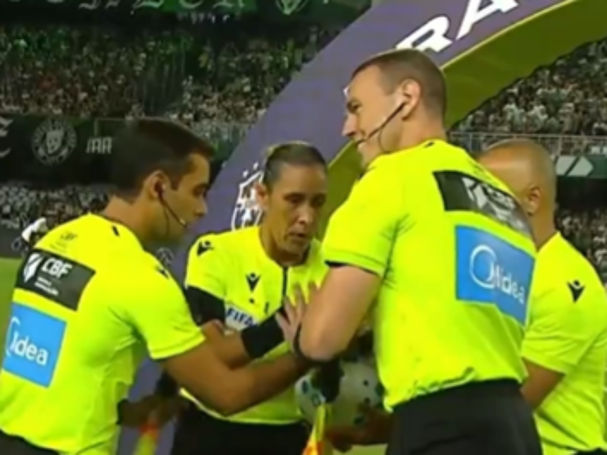 Após o comentário, ele riu e se virou para uma última saudação com o restante da equipe de arbitragem, que também conta com Leone Carvalho Rocha e Deborah Cecilia Cruz Correia.