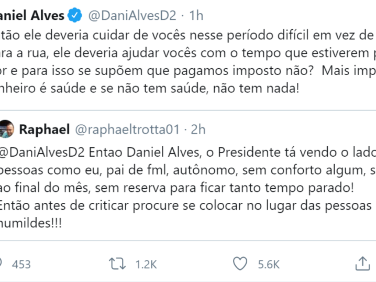 Momentos depois, Dani Alves utilizou as suas redes sociais para repudiar o discurso. "Senhor presidente, respeito muito a sua presidência, respeito muito a vossa senhoria, mas são muitas famílias e muitas pessoas trabalhando em prol do combate a essa pandemia e o senhor, como a pessoas mais importante desse país, deveria também prezar pelo bem do nosso país e do nosso povo", comentou, por meio do seu Instagram oficial.