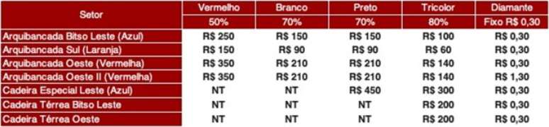 Ou seja, na prática os valores reais dos ingressos são aqueles que serão arcados pelos sócios torcedores. Uma entrada para a Arquibancada Oeste, que custará R$ 700 (inteira), sai por R350 para o sócio do plano Vermelho, R$ 210 para o sócio do plano Branco ou Preto, R$ 140 para o sócio do plano Tricolor e apenas R$ 0,30 para o sócio do plano Diamante.