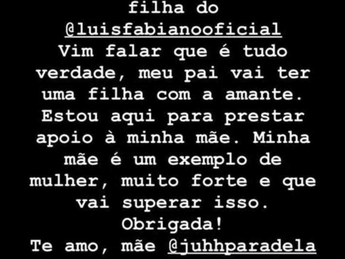"Vim falar que é tudo verdade, meu pai vai ter uma filha com a amante. Estou aqui para prestar apoio à minha mãe. Minha mãe é um exemplo de mulher muito forte e que vai superar isso. Obrigada. Te amo, mãe", escreveu Giovanna Clemente.