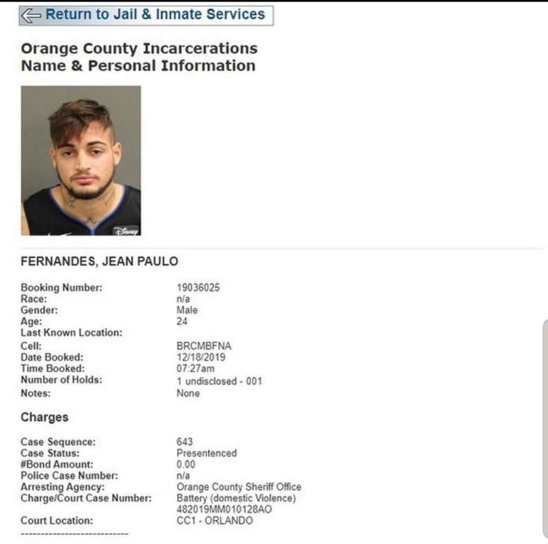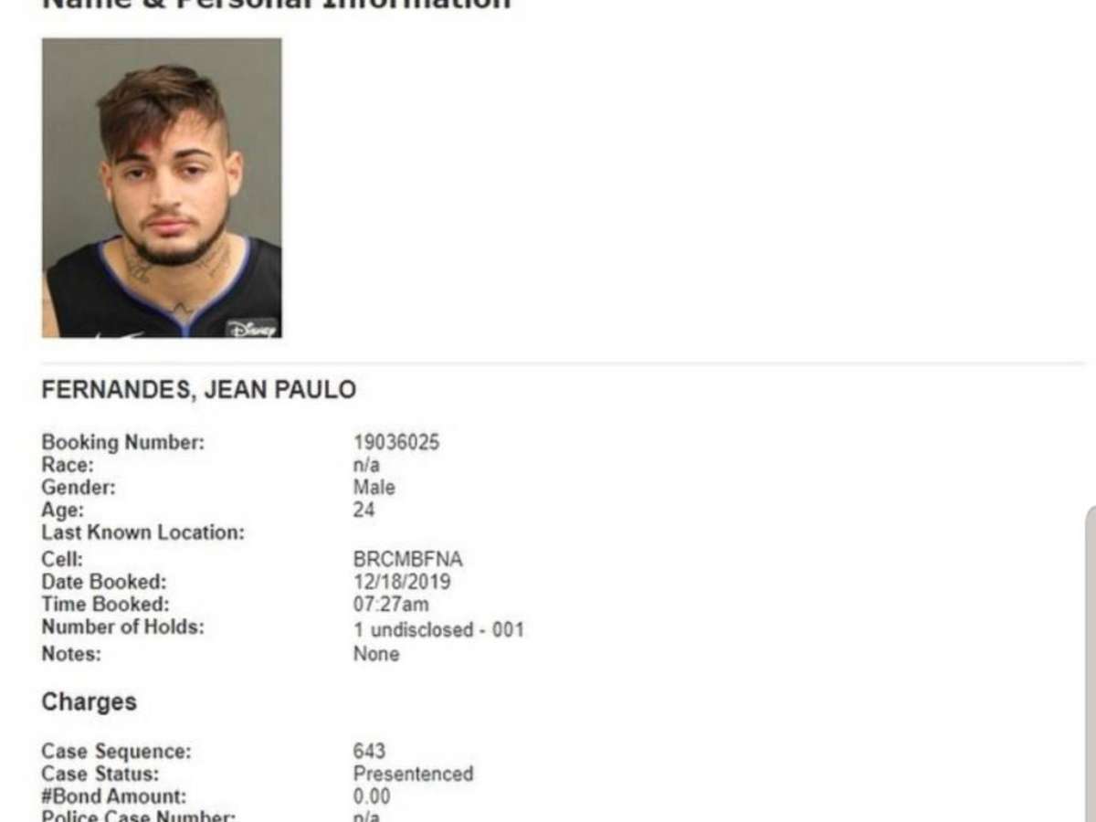 De acordo com as informações da ficha, Jean foi detido às 7h27 (horário de Orlando) e pré-sentenciado por violência doméstica. As acusações de Milena Bemfica, esposa do atleta, ocorreram na madrugada desta quarta-feira, por meio de publicações no Instagram.
