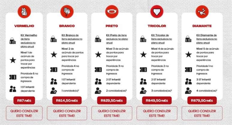 São cinco categorias diferentes no novo programa de sócio torcedor do São Paulo. O adepto que quiser aderir um dos planos pode escolher entre o Vermelho, R$ 14 mensais, o Branco, por R$ 29 mensais, o Preto, por R$ 59 mensais, o Tricolor, por R$ 99 mensais, e o Diamante, por R$ 159 mensais.