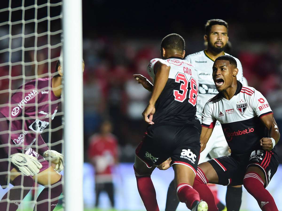 O São Paulo quase abriu o placar logo aos quatro minutos, quando Wellington Rato cobrou escanteio na medida para Lucas Beraldo cabecear, mas o goleiro Léo Vieira, ex-Tricolor, esbanjou reflexo, fazendo uma defesaça para evitar o primeiro gol dos donos da casa.