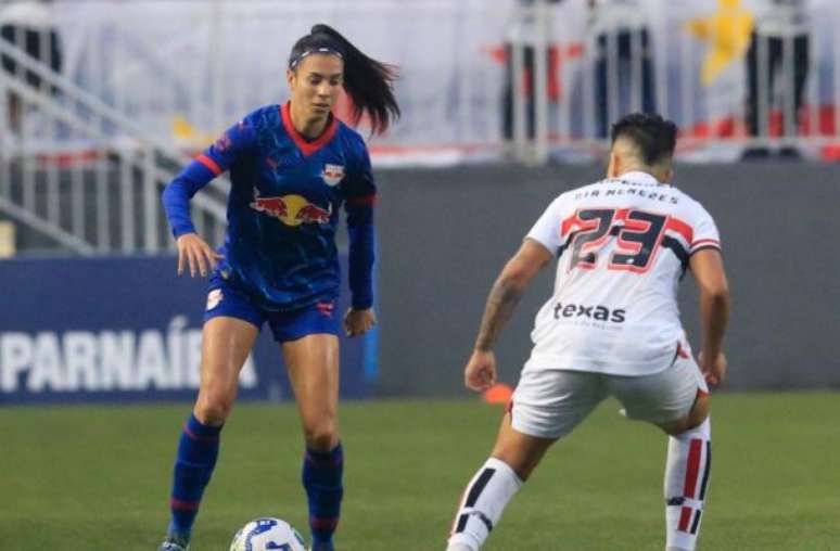 A partida começou equilibrada, com oportunidades para os dois lados. Giovanna Crivelari parou em Thalya, enquanto Paulinha foi travada pela defesa. A atacante do Bragantino ainda mandou uma finalização para fora, assim como Isa Guimarães, pelo Tricolor. Na segunda oportunidade que teve, a atacante arriscou de fora da área e abriu o placar para o São Paulo.