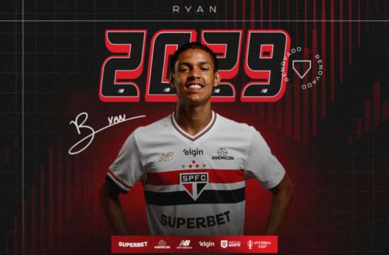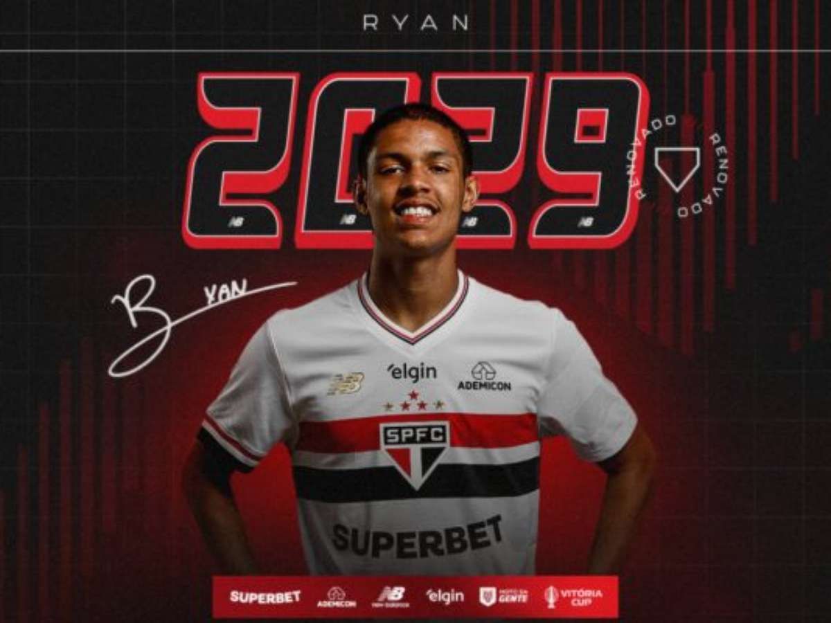 O São Paulo anunciou nesta sexta-feira (16/1) a renovação contratual com o atacante Ryan Francisco, de 19 anos. A joia, afinal, assinou novo vínculo, agora previsto para o fim de 2029. Antes, seu contrato ia até 30 de novembro de 2028.