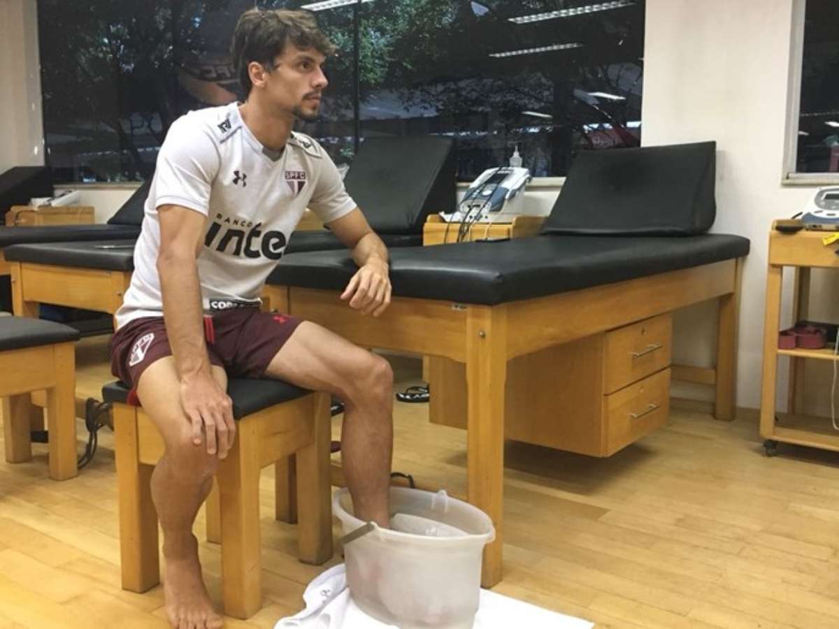 O camisa 3 iniciou o tratamento ainda antes de retornar à capital paulista, na última segunda-feira, fazendo fisioterapia em pleno aeroporto de Fortaleza. Após desembarcar em São Paulo, ele foi submetido a uma ressonância magnética, que não acusou lesões de ligamento ou de cartilagem.