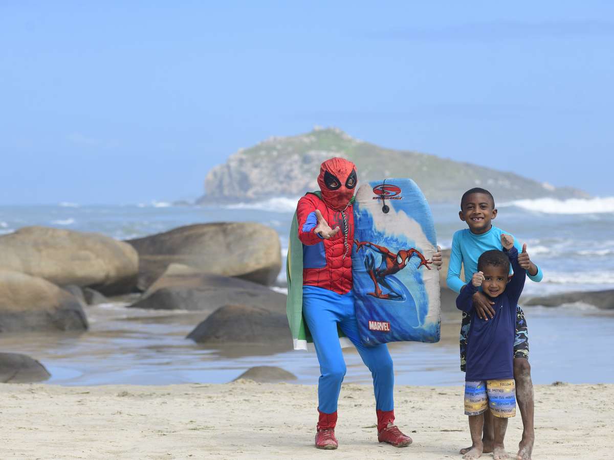 Homem-Aranha, Super-Homem... Quem acompanha a terceira etapa do Circuito Banco do Brasil de Surfe 2025 nas areias da Praia da Vila se depara, todos os dias, com um 'super-herói' diferente protegendo a orla catarinense.