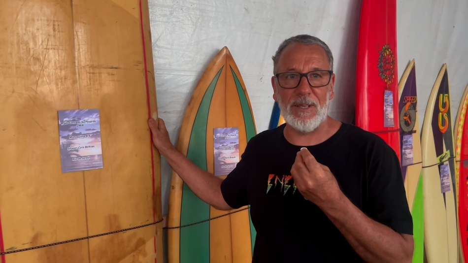 Natural de Porto Alegre (RS), Ben-Hur Naymayer, 53, é um dos expositores que integra o surfe ao público em etapa da WSL em Imbituba (SC). "O surfista não é nada sem sua prancha": o lema do colecionador Ben-Hur Gomes Naymayer, 55, se materializa em um torneio como a 3ª etapa do Circuito Banco do Brasil de Surfe 2025 na Praia da Vila, em Imbituba (SC), onde atletas desfilam, às vezes, com duas ou três pranchas. A variedade de opções mostra como o equipamento evoluiu desde que o surfe passou a ser difundido no Brasil, na década de 1960. lmagens: Gabriel Gatto/Repórter Terra