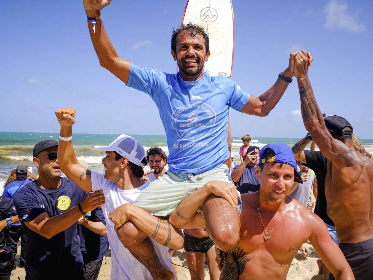 Michel Roque, aos 41 anos, conquistou sua primeira vitória em uma etapa do QS da WSL na Praia do Futuro, superando desafios e celebrando ao lado de família e amigos, no melhor resultado de sua carreira.