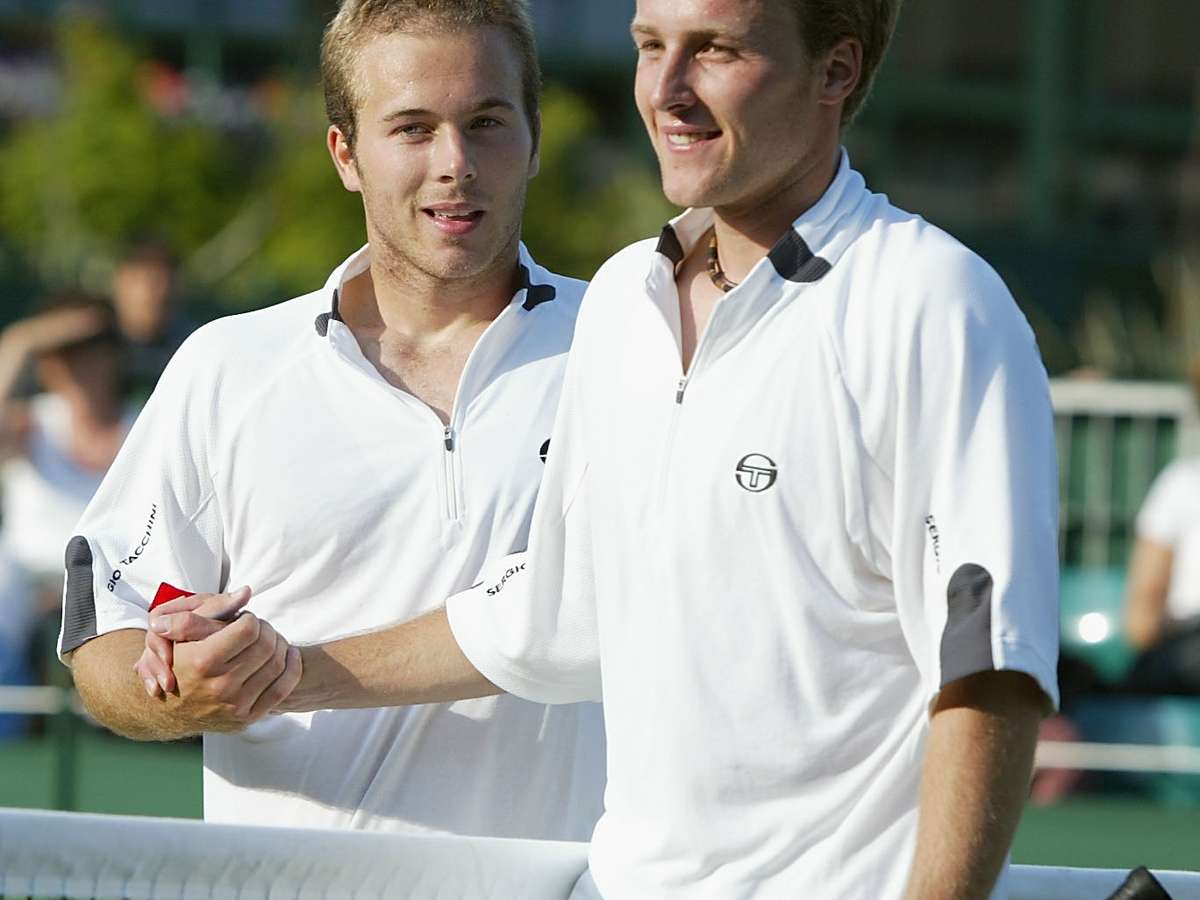 Belga Christophe Rochus (à dir.) cumprimenta o irmão, Olivier, após derrota em Wimbledon, em 2002