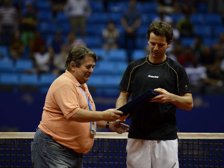 Depois de mais acenos, Mello correu para a lateral da quadra, onde recebeu o cumprimento do amigo Flávio Saretta, ex-profissional que foi o 44º colocado do ranking em 2003 e se aposentou em 2009, as 28 anos.