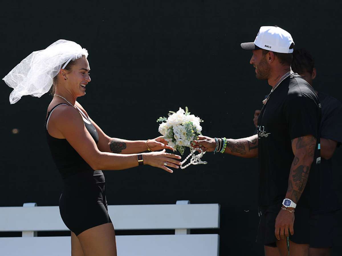 Sabalenka usa véu em torneio de tênis e recebe buquê do noivo brasileiro