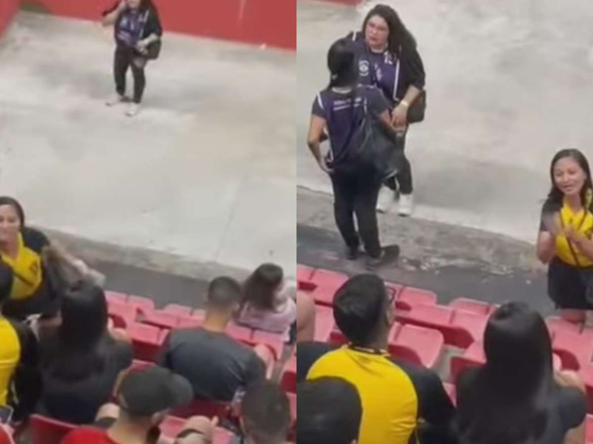 Nas imagens, feitas por um torcedor e que depois foram parar nas redes sociais, é possível ver o momento em que a mulher, com a camisa amarela, se aproxima do companheiro e diz: “É para olhar mesmo, para ver quem é você”, aplaudindo, de forma irônica, o casal.