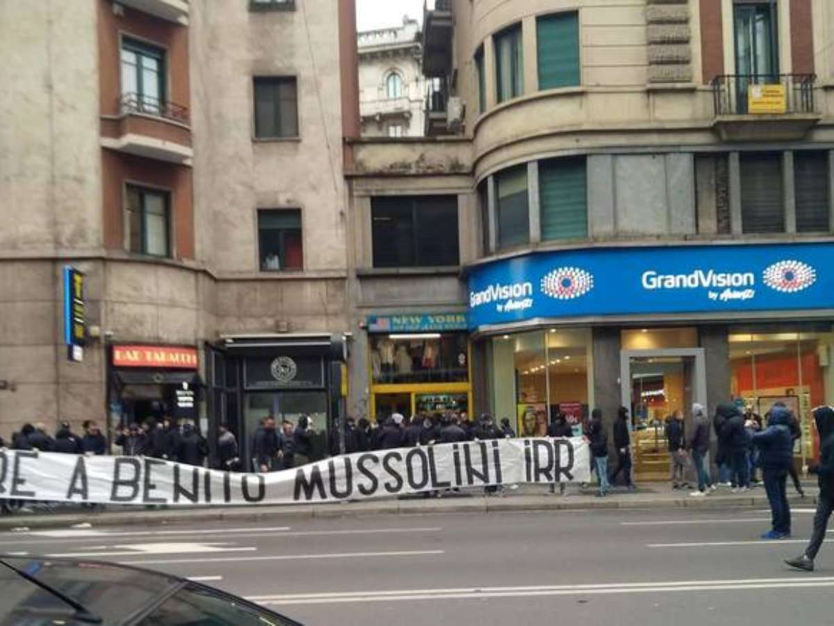 Um grupo de torcedores organizados da Lazio estendeu uma faixa que faz apologia a Benito Mussolini em Milão, nesta quarta-feira (24), véspera do Aniversário da Libertação da Itália do regime nazifascista.
