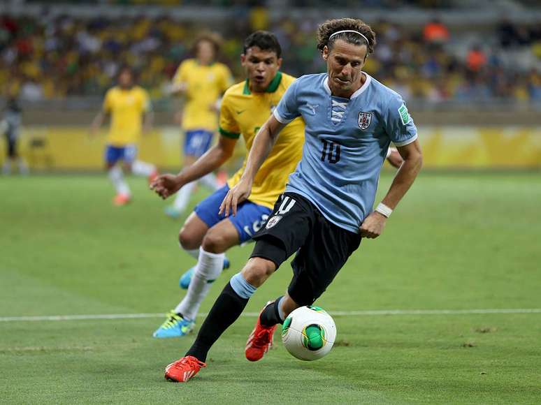 Paulinho tenta recuperar a bola de Forlán. O volante foi desfalque contra a Itália e voltou ao time titular nesta quarta-feira