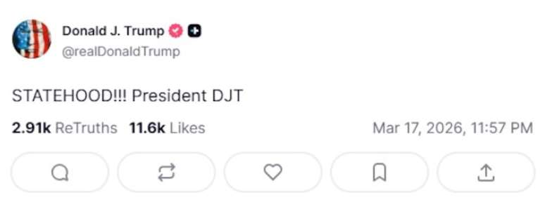 Em publicação nas redes sociais, o mandatário estadunidense voltou a sugerir que o país sul-americano poderia se tornar um estado norte-americano, repetindo a expressão "Statehood" — condição de ser um país ou parte de um país com governo próprio —, usada anteriormente em outras ocasiões.