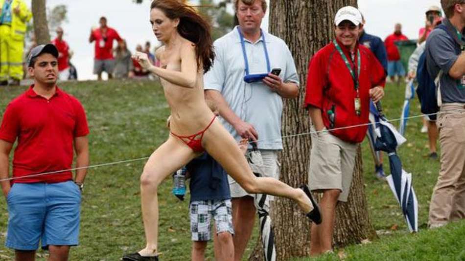 Esportes Torcedor flagra invasão de mulher seminua em jogo de golfe Exibir comentários Compartilhar Apenas de fio dental e adesivos colados pelo corpo, torcedora foi a atração do Presidents Cup, tradicional torneio de golfe dos EUA Reprodução Publicidade