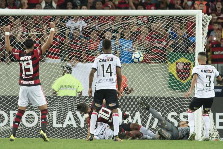 A pressão continuava. Vitinho chutou e Ronaldo mandou para escanteio. Até que aos 40 minutos, Vitinho mandou na área da esquerda, Paquetá cabeceou, o goleiro Ronaldo deu rebote e Diego apareceu para abrir o marcador.