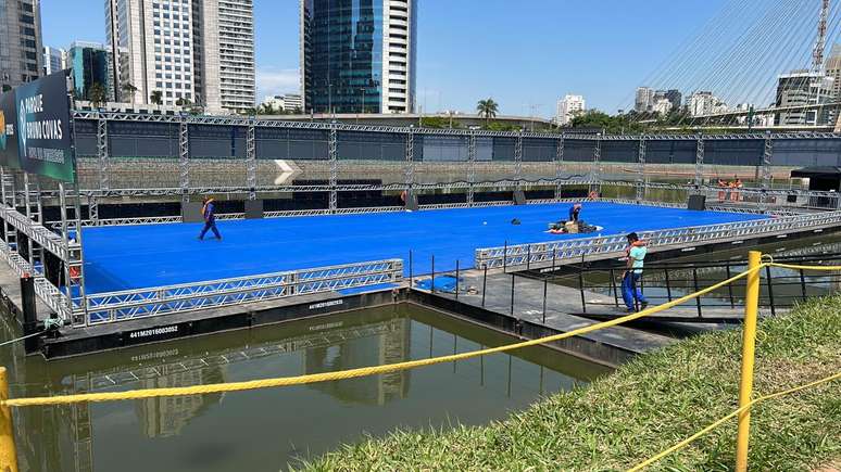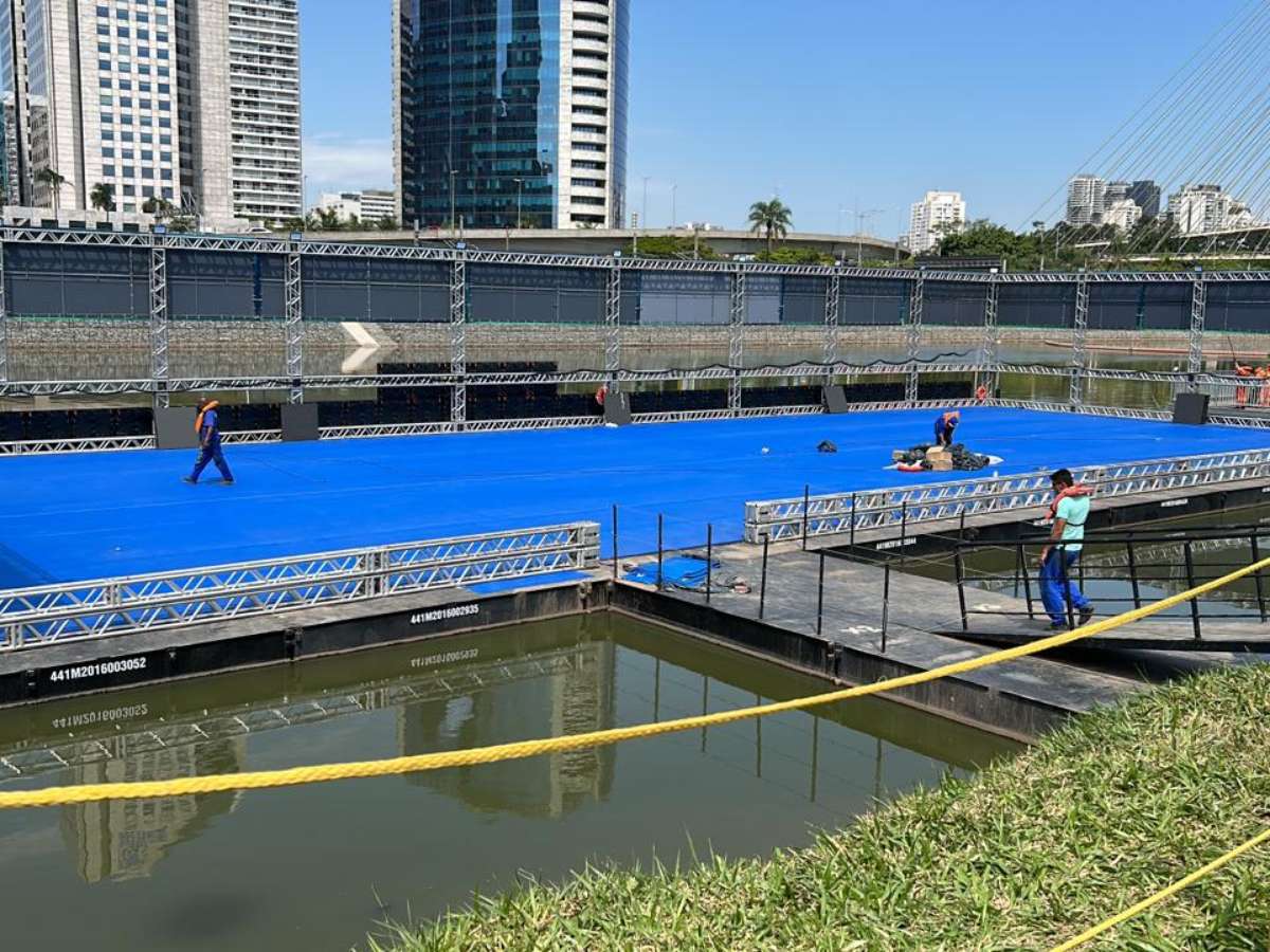 Ação leva quadra de vôlei para dentro do Rio Pinheiros para jogo entre lendas