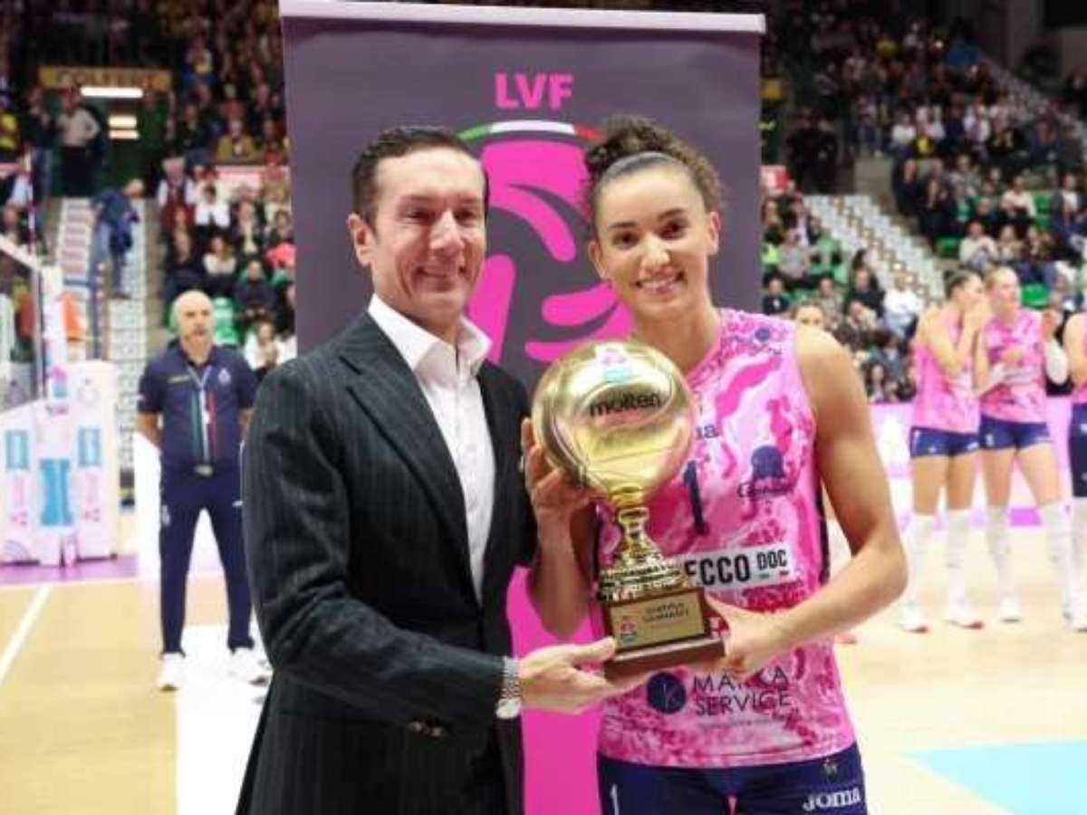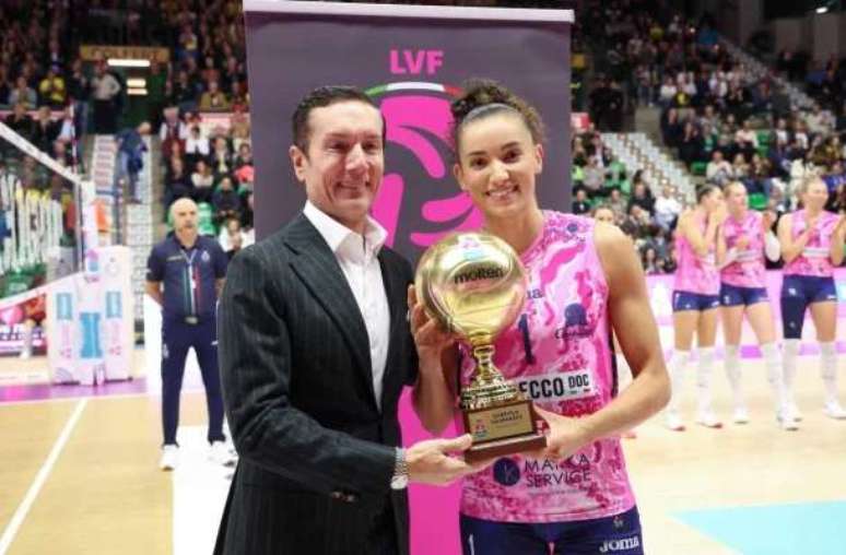 Antes da partida entre Conegliano x Milão, nesta quarta-feira (5/11), a Liga Italiana entregou para a ponteira Gabi o troféu de melhor jogadora (MVP) do Campeonato Italiano feminino de vôlei 2024/2025.