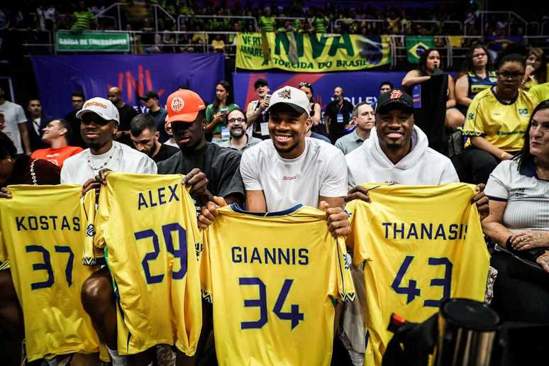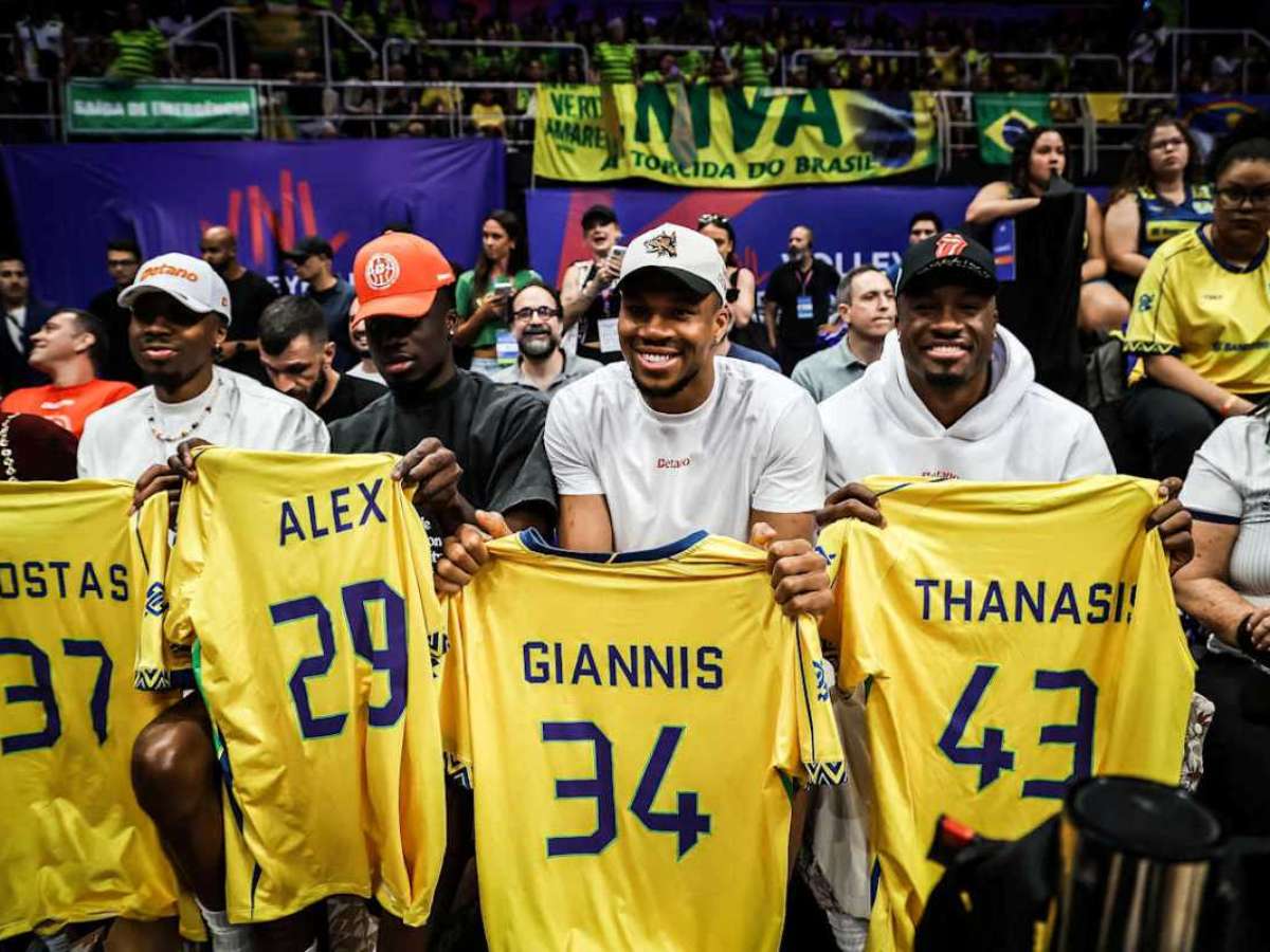 Giannis está no Brasil para eventos. Hoje, ostentava a marca de uma casa de apostas na camisa. Nos últimos dias, ele anunciou nas redes sociais a vinda para o Brasil, respondendo uma postagem de Eduardo Paes, prefeito da cidade do Rio de Janeiro.