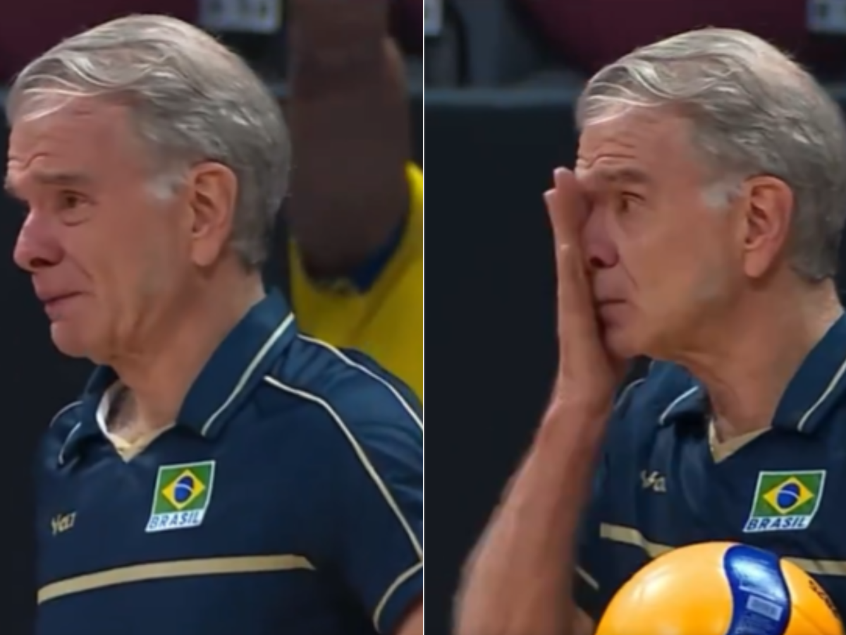 À beira da quadra, o treinador cantou o hino brasileiro com o olhar para cima. Ainda no aquecimento, as lágrimas tomaram seu rosto, conhecido pela expressão nervosa.
