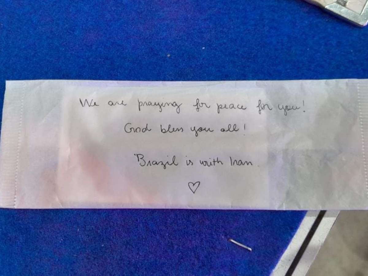 "Nós estamos rezando pela paz. Deus abençoe vocês. O Brasil está com o Irã". Um bilhete escrito à mão, em um guardanapo, foi entregue ao técnico Roberto Piazza, comandante da seleção masculina de vôlei, antes da partida entre Brasil x Ucrânia, na manhã deste sábado (14/6), no Ginásio do Maracanãzinho, no Rio de Janeiro, pela primeira semana de disputas da Liga das Nações (VNL).
