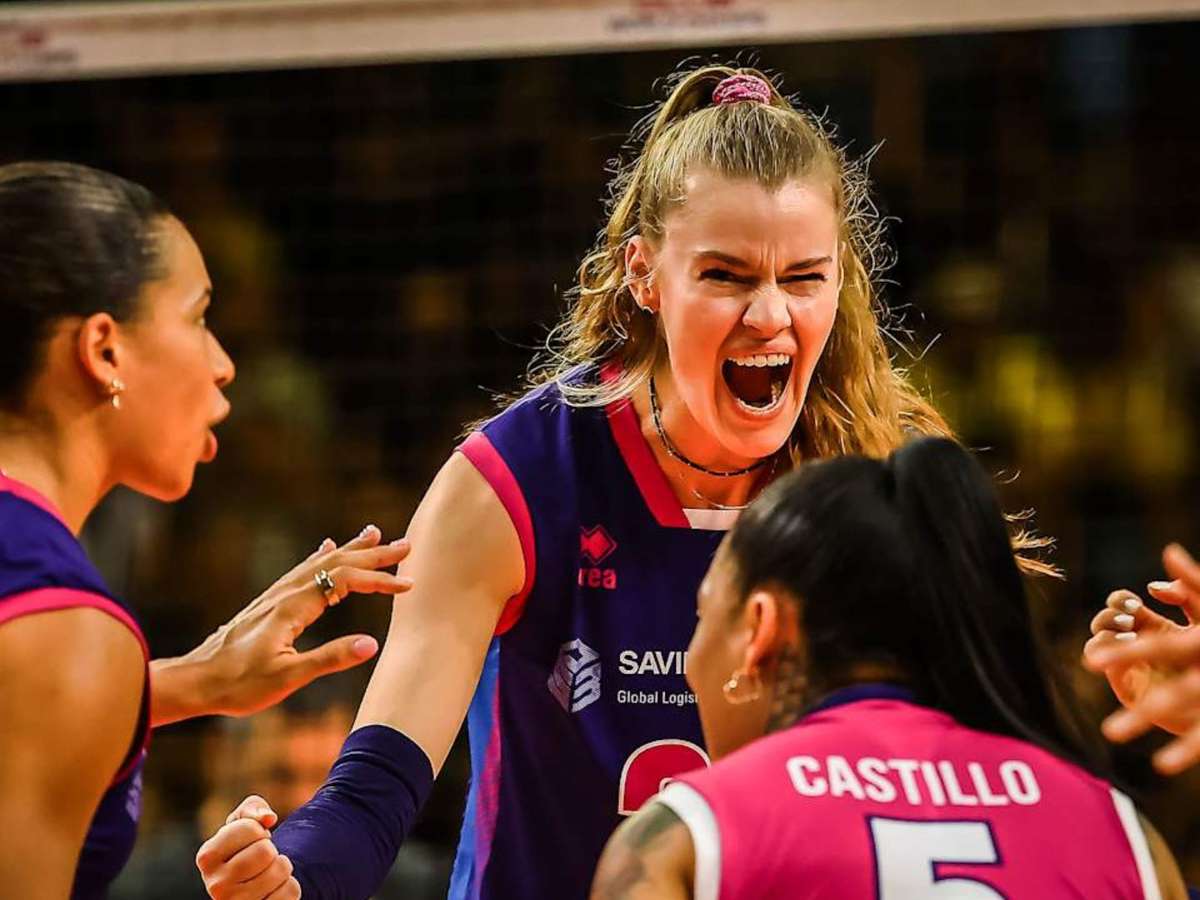 No entanto, na reta final do segundo set, as europeias retomaram o controle, embora tenham enfrentado resistência. Caffrey cresceu ofensivamente pelo lado brasileiro, enquanto Natinha brilhou na defesa, salvando bolas improváveis e ainda evitando um set point. Mesmo assim, o Scandicci manteve a consistência, contou com a força de Antropova e fechou o set em um bloqueio decisivo de Graziani, por 26 a 24.
