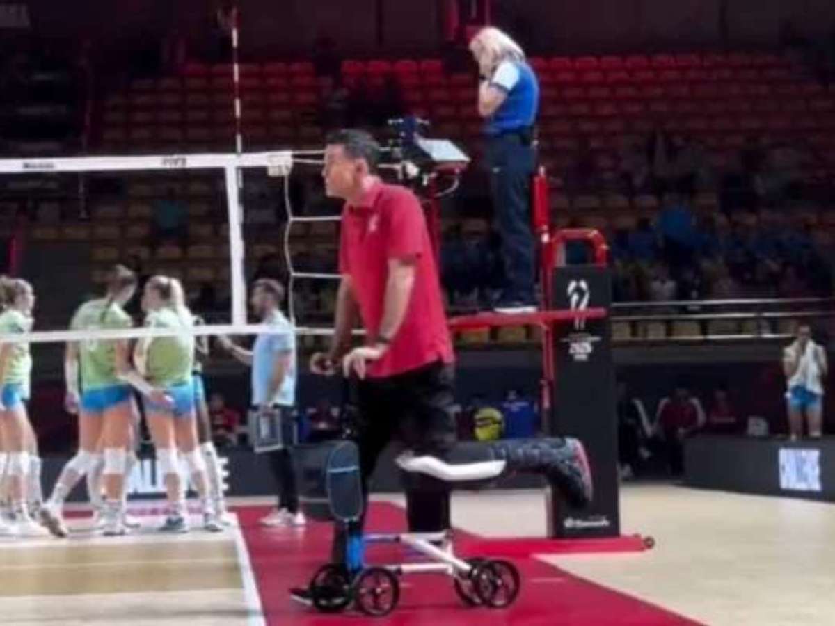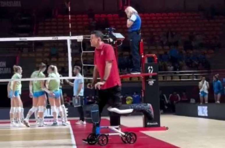 O técnico Erik Sullivan chamou a atenção na estreia dos Estados Unidos no Campeonato Mundial feminino de vôlei, nesta sexta-feira (22/8). Com o tornozelo imobilizado, ele precisou do auxílio de um triciclo para se aproximar das atletas durante a partida contra a Eslovênia, em Nakhon Ratchasima, Tailândia.