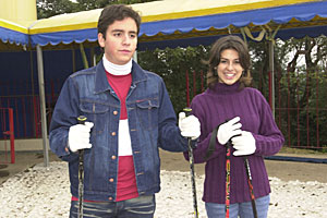 Os atores do seriado Sandy e Junior acordaram bem cedo para aproveitar a pista de esqui do parque SKI Mountain Park.