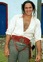 Humberto Martins se gaba de ser um dos "curingas" do autor Carlos Lombardi. Tal e qual o chavão futebolístico, o ator se considera versátil a ponto de atuar em várias posições. Uma breve retrospectiva, no entanto, prova o contrário. Desde que estreou na Globo há 12 anos, ela já foi caminhoneiro em Barriga de Aluguel, cigano em Pedra Sobre Pedra e médico em Quatro por Quatro. Todos os papéis, sem exceção, evocavam a figura do herói sensual – de bom caráter mas sem papas na língua –, sempre disposto a ajudar o próximo e a enlouquecer o mulherio. O Chalaça, de O Quinto dos Infernos, não foge à regra. "Não me incomodo de fazer sempre o herói da história. Sou mesmo privilegiado por ter o porte atlético e a voz forte", enumera. A parceria estabelecida com Carlos Lombardi reforça a idéia de que Humberto Martins é ator de um personagem só. Afinal, o Chalaça de O Quinto dos Infernos é muito parecido com o Baldochi de Uga Uga, que, por sua vez, era idêntico ao Bruno de Quatro por Quatro. Na nova minissérie da Globo, Humberto interpreta Francisco Gomes da Silva, o Chalaça, um vigarista mulherengo que vive de pequenos golpes. Quando foge para o Brasil, torna-se o melhor amigo de D. Pedro I, vivido por Marcos Pasquim. "O Chalaça é um fanfarrão que não se prende a mulher nenhuma e quer sempre comer as mais gostosas. Já tive a minha fase Chalaça, mas não durou muito", jura, irônico. Assim que terminar a minissérie, Humberto vai partir para uma nova parceria com Lombardi. Os dois têm planos de fazer cinema em 2002 e já convidaram o diretor Alexandre Avancini para assumir o projeto. O protagonista idealizado por Lombardi, aliás, não é nenhum primor de originalidade. No filme, Humberto interpreta o policial de uma grande cidade, tão valente e destemido quanto o Baldochi de Uga Uga. Embora só tenha atuado uma vez no cinema - como o protagonista de Tiradentes, de Oswaldo Caldeira -, guarda ótimas recordações de um "set". "Fui tratado como um rei. Cheguei a dizer ao Caldeira que ele estava me acostumando mal", ri. Você é sempre criticado por interpretar o mesmo personagem. O que o Chalaça tem de novo a acrescentar na sua carreira? Os personagens são mais ou menos parecidos porque o estilo do autor se equivale. Todo autor de novela tem o seu estilo e o Lombardi não foge à regra. O Chalaça, porém, é diferente de tudo que já fiz. É um personagem alegre, para cima, gozador. Um cara que tira sarro até das situações mais adversas. Os outros personagens tinham uma concepção mais autodestrutiva. O Baldochi, por exemplo, tinha pouco amor à vida. Vivia se metendo em enrascadas. O Chalaça, ao contrário, quer se safar sempre. Luta para sobreviver. Qual a maior dificuldade que encontrou para compor o papel? O linguajar de época é sempre difícil de ser assimilado. Tenho dificuldade para falar o texto na velocidade que o Lombardi quer. Ainda bem que fiz Tiradentes. O filme do Oswaldo Caldeira tem me ajudado muito. Não só em relação à construção do personagem, mas também no que diz respeito ao texto impostado. O Chalaça é, sem dúvida, um dos personagens mais difíceis que já fiz. Você chegou a ler O Chalaça, escrito pelo José Roberto Torero? Não achei necessário. Confio bastante no Lombardi. Basta seguir o texto dele, que não tem erro. A sinopse que ele ofereceu ao elenco é fantástica de tão completa. Como já disse, o Chalaça é um gozador. Um cara que acredita que pode tudo. E, por isso mesmo, consegue tudo. Não por acaso, vira secretário de D. Pedro I. Fora isso, é um fanfarrão. Não se prende a mulher nenhuma e quer sempre comer as mais gostosas. O que você acha de ser sempre escalado para interpretar o "herói" das histórias do Lombardi? Acho que tenho o "physique du rôle" de herói. Tem sido assim desde os primeiros trabalhos na tevê. Gosto também de praticar esportes. Isso ajuda muito. Sempre me propus a montar cavalos, pular ribanceiras e assim por diante. Nunca fugi deste tipo de responsabilidade. Sempre que possível, gosto de fazer as cenas mais difíceis. Antes de começar a gravar a minissérie, por exemplo, tive aulas de esgrima, capoeira e equitação. Não vejo problemas nisso, apesar do meu dublê, Jorge Só, ser também muito bom. Por essas e outras, o Lombardi logo sacou que sou um profissional capaz de corresponder às expectativas. Às vezes, correspondo. Outras vezes, não. Mas se está dando certo, por que não vamos continuar por esse caminho? Mas você não tem medo de ficar se repetindo no vídeo? Não quero parecer pedante, mas também não vou ser hipócrita. A tevê tem muita dificuldade para encontrar atores que transmitam uma imagem de virilidade. Não quero falar dos meus colegas, mas há uma certa deficiência no mercado. Sou privilegiado por ter o físico avantajado e a voz forte. Fazer o machão não me incomoda. O Chico, que fiz em Corpo Dourado, por exemplo, fugia deste estereótipo. Dos personagens que fiz, talvez ele fosse o mais comedido. E, por isso mesmo, o mais parecido comigo. Sou sisudo, comedido. Às vezes, passo até por antipático. Mas não tem problema. Não sou de pôr para fora tudo o que penso. Você costuma ser muito assediado nas ruas? Graças a Deus. O assédio do público feminino é carinhoso. É uma forma de reconhecimento ao nosso trabalho. E isso é o melhor que pode existir para um ator. O assédio só fica um pouco ensandecido, quando o ator está no ar. Aí, fica quase insuportável. Mas não sou só galã. Tenho outras qualidades como ator. Mas não é frustrante o fato de alguns personagens explorarem mais os seus dotes físicos do que seus recursos dramáticos? Não chega a tanto. Mas acho que a exploração do físico dos homens é compreensível. A tevê é uma indústria. Mas acho também que o Chico, de Corpo Dourado, mostrou um outro caminho a seguir. Graças a ele, o físico ficou em segundo plano e o Humberto Martins em primeiro. Chico é um di