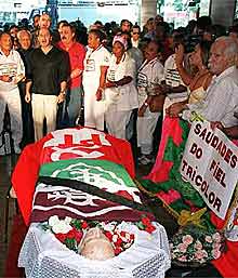 Amigos, fãs e familiares cumpriram o prometido ao ator, cantor e compositor Mário Lago, morto na noite desta quinta-feira, no Rio de Janeiro, vítima de um edema pulmonar.Antes de morrer, ele deixou um pedido expresso: não queria tristeza em sua despedida. Os amigos tentaram manter o clima de boêmia que ele tanto admirava. Durante todo o velório, que aconteceu no teatro João Caetano, foram interpretadas composições do próprio Mário Lago. Veja também: » Morre o ator, escritor e compositor Mário Lago » Na música, Mário Lago era um afiado cronista popular » MST e Fluminense presentes na última homenagem ao ator » FHC lamenta a morte de Mário Lago Conduzido por um carro do Corpo de Bombeiros, o corpo do artista foi enterrado no cemitério São João Batista (RJ). Um dos netos do escritor, compositor, ator, radialista, militante político e diretor, Jan Teóphilo, disse em entrevista que seu avô deixou para o país uma lição de brasilidade. "Ele mostrou que é possível ser brasileiro através da nossa cultura, com a música e o teatro, por exemplo. Não precisamos copiar nenhum modelo do exterior". Segundo ele, no velório, ontem à noite, também compareceram grupos de adolescentes e de garis. A governadora do Rio de Janeiro, Benedita da Silva, também compareceu ao enterro. O candidato do PT a presidente da República, Luiz Inácio Lula da Silva, divulgou uma nota em que lamentava a morte do ator e compositor. O presidente FHC também divulgou nota sobre a morte de Mário Lago. No texto emitido pela Secretaria de Comunicação, o presidente dizia que: "Como compositor, Mário Lago mostrou, com sensibilidade e delicadeza, a alma e a alegria do povo brasileiro. Como cidadão, lutou pela construção de um Brasil mais justo para todos os seus filhos. Sua morte é uma perda para todos nós".
