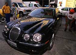 A modelo Viviane Araújo visitou o noivo e cantor Belo, ontem (6), às 21h40, na delegacia Divisão Anti-Seqüestro (DAS), no Leblon, Zona Sul do Rio. Viviane chegou ao local dirigindo um carro importado Jaguar, que recebeu de presente do pagodeiro. Belo está preso, desde o último dia 5, com mais sete detentos, entre eles quatro seqüestradores da atriz Vanessa Bueno, um suposto integrante da quadrilha de Fernandinho Beira-Mar e outros dois suspeitos de seqüestro. Leia mais: » Advogados pedem habeas-corpus
