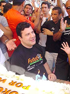 Vários globais participaram ontem de uma partida de futebol para comemorar o aniversário de 43 anos de Gerson Brenner e arrecadar dinheiro para ajudar no tratamento do ator, que está paraplégico desde que levou um tiro em um assalto em 1998.» Veja as fotos do jogo beneficente Eri Johnson, Eduardo Galvão, Thierry Figueira e Iran Malfitano foram alguns dos artistas que suaram pela causa do colega durante as partidas realizadas no Iate Clube Jardim Guanabara, no Rio de Janeiro. Na platéia, o jogo foi acompanhado por Raul Gazolla, que estava com o joelho machucado, Suzana Werner, que ainda exibe os quilos a mais ganhados durante a gravidez, e Dora Bria. Com a ajuda da irmã Cristina, Gerson Brenner fez questão de dar o pontapé inicial na partida. Depois, ele ganhou um bolo com mensagens de otimismo.