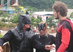 » Veja as fotos!Marcos Mion e Otávio Mesquita gravaram ontem (24) um quadro especial para o programa A Noite é uma Criança, da Band, no parque de diversão Hopi Hari, em São Paulo. Os apresentadores chegaram ao parque em uma pick-up vermelha vestidos de Batman e Robin. Durante as gravações, Rita Cadillac fez uma surpresa a Otávio Mesquita e chegou vestida de Mulher-Gato. O trio aproveitou a visita para se divertir num simulador de vôo de asa-delta e na quinta maior montanha-russa de madeira do mundo.