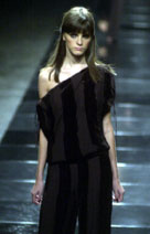 Seguindo a atendência adotada na coleção de verão, a Forum volta a bater na tecla da sensualidade em sua linha de inverno 2002. Dessa vez o toque é retrô, como se pode ver pelos plissados, vestidos que lembram combinações dos anos 40, casquettes, echarpes e boinas bordadas em paetês. A silhueta veio fluida, com tecidos leves como chiffon, georgette, contrapostos ao veludo, como no lindo conjunto de top e calça usados por Jeísa. Vestidos esvoaçantes em tons de salmão, preto, ou de pois, sempre usados com sandálias de saltos altíssimos e meia-calça, realçaram o caráter da feminilidade. As calças surgiram com a boca bem larga e cintura baixa em tecidos como o jeans, a sarja e o algodão flocado. Os tops levinhos, que deixavam os ombros à mostra, também tiveram seu espaço. As cores ficaram no rosa, preto, pele e tabaco. Nas estampas, apenas pois e uma duvidosa oncinha em fúcsia usada num vestido com babados na barra. De frio mesmo, apenas os cabans em couro, alguns tricôs e poucas jaquetas em lã. Para os homens, Tufi Duek manteve-se fiel ao estilo que ele mesmo costuma usar: calça jeans reta, tricô de gola alta e paletó por cima, tudo usado com tênis.
