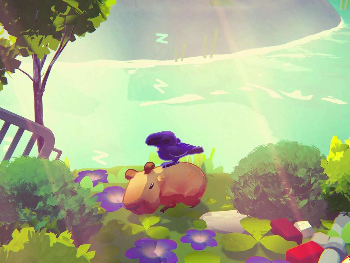Antes de começar o teste, fui contextualizado sobre a história. A protagonista é uma capivara chamada Capy, que tem como fiel companheiro um corvo chamado Corvi. Quando me explicaram essa amizade improvável, achei curioso, mas logo tudo fez sentido: após uma enchente atingir o zoológico onde Capy vivia, ela acaba em uma ilha remota, onde Corvi surge como um guia espirituoso e bem-humorado, sempre pronto para explicar o que está acontecendo.