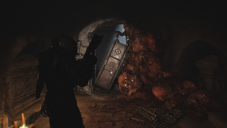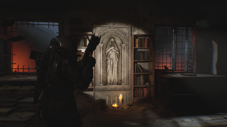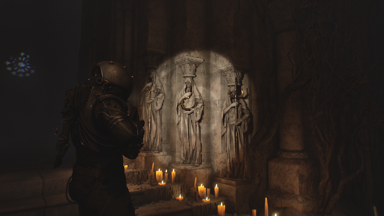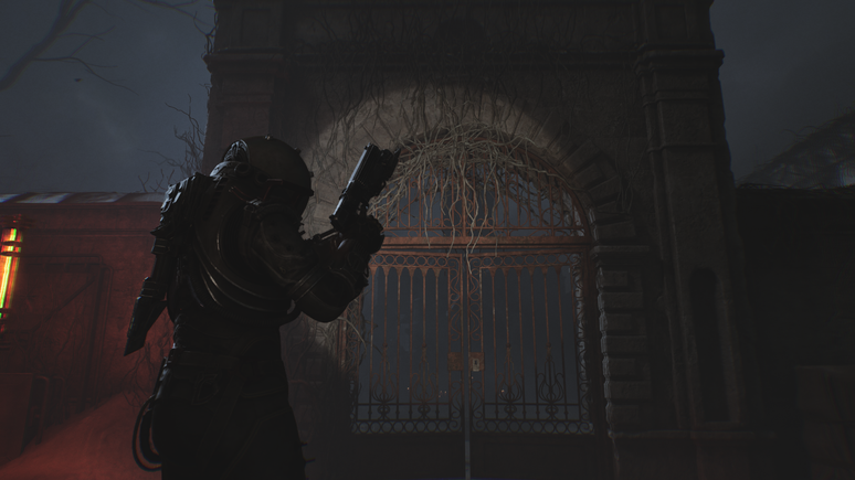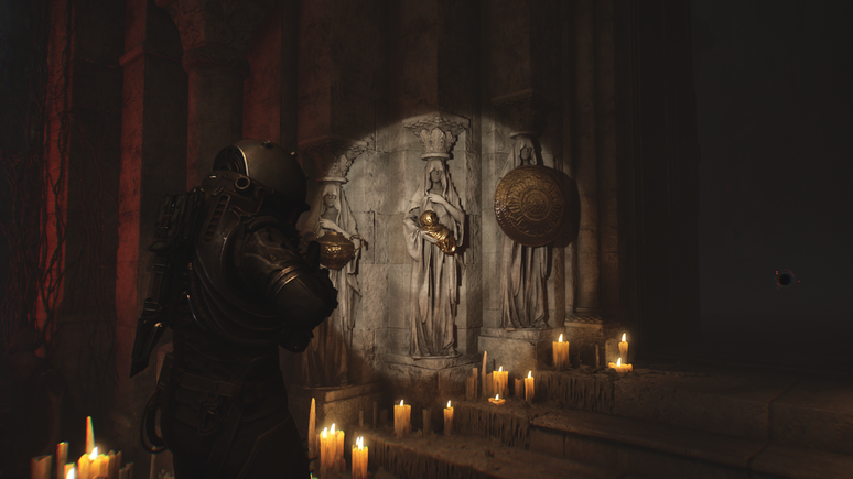 Depois de superar o mini-labirinto de paredes de carne e coletar o tridente, pegue o fusível próximo ao corpo de um viajante. Em seguida, retorne ao ponto de salvamento perto das estátuas e posicione o fusível para liberar o acesso ao último item do enigma. Essa etapa traz apenas alguns inimigos, mas é bem mais tranquila em comparação ao que enfrentamos até aqui. Usando as botas gravitacionais para subir até o prédio, será possível encontrar a espada, o último objeto necessário para concluir a charada.