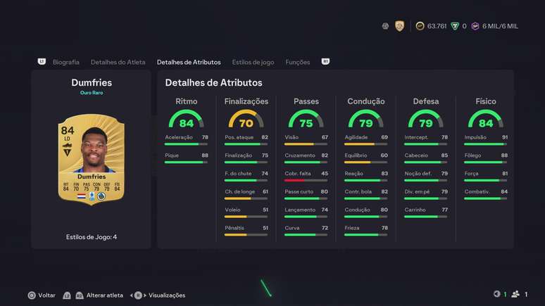 Dumfries virou referência depois da última Champions League e chega ao FC 26 como uma opção sólida para a lateral direita. Ele tem quatro estilos de jogo no prata, o que já mostra a versatilidade. Entre eles estão veloz, impulso e lateral longo, que ajudam tanto no ataque quanto na transição defensiva. O maior destaque é o cabeceio preciso, fundamental em jogadas de bola parada, especialmente nos escanteios. É o tipo de lateral que passa confiança e entrega bem em diferentes situações de jogo.