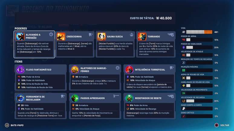 Torbjörn funciona muito bem quando a ideia é ganhar espaço pouco a pouco e punir quem tenta avançar sem pensar. Crescidinha e Aliviando a Pressão ajudam a manter presença constante nas primeiras lutas, enquanto Sauna Sueca e Torrando entram para acelerar o ritmo quando o confronto esquenta. Nos itens, Redefinidor de Rebite e Passos Apressados garantem controle e reposicionamento, com Ferramenta de Reciclagem e Inteligência Torreficial sustentando o jogo mais longo. Injetores de Sangue-Férrero e Fluxo Fantasmático fecham a build dando fôlego extra para segurar pressão até o fim de cada rodada.