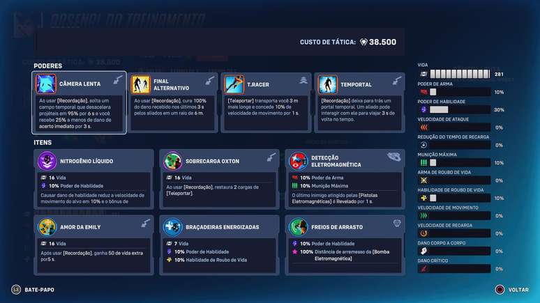 Tracer recompensa quem joga no limite e sabe escolher bem quando entrar e sair. Câmera Lenta e Final Alternativo ajudam a controlar o ritmo logo no começo, enquanto T. Racer e Temporal ampliam o potencial de perseguição e fuga. Braçadeiras Energizadas e Freio de Arrasto mantêm a mobilidade afiada, com Nitrogênio Líquido e Amor da Emily dando suporte para trocas mais longas. Sobrecarga Oxton fecha a build garantindo que Tracer continue perigosa mesmo nas rodadas finais, desde que o posicionamento seja bem executado.