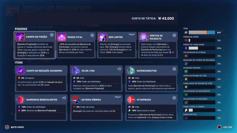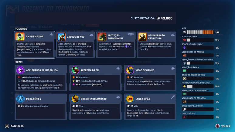 Orisa funciona melhor quando o objetivo é segurar posição e punir quem tenta forçar avanço sem coordenação. Cascos de Aço e Restauração Estrutural dão a sustentação necessária no começo, enquanto Proteção Emergencial e Amplificador ajudam a virar lutas prolongadas a seu favor. Chassi Encouraçado, Lança Sifão e Meka Série Z fortalecem o controle de espaço nas primeiras rodadas. Já no fim da partida, Teorema da Efi, Visão de Campo e Acelerador de Luz Sólida deixam Orisa ainda mais sólida, garantindo presença constante mesmo sob pressão pesada.