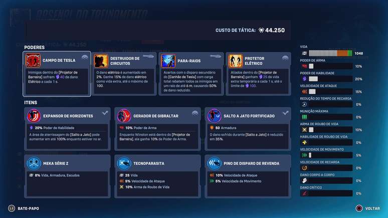 Winston é perfeito para quem gosta de iniciar lutas e criar caos na retaguarda inimiga. Para-raios e Protetor Elétrico ajudam a sobreviver às primeiras investidas, enquanto Destruidor de Circuitos e Campo de Tesla garantem impacto imediato ao mergulhar no time adversário. Tecnoparasita, Pino de Disparo de Revenda e Meka Série Z funcionam bem no início para sustentar entradas frequentes. Já nas rodadas finais, Gerador de Gibraltar, Expansor de Horizontes e Salto a Jato Fortificado deixam Winston muito mais resistente, permitindo iniciar lutas decisivas e sair vivo para repetir o processo.