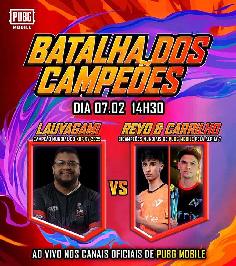 Para promover a parceria, será realizada uma transmissão ao vivo, neste sábado (7), com os campeões mundiais do Battle Royale pela Alpha7 Esports e Lauyagami, campeão mundial de The King of Fighters XV em 2025.
