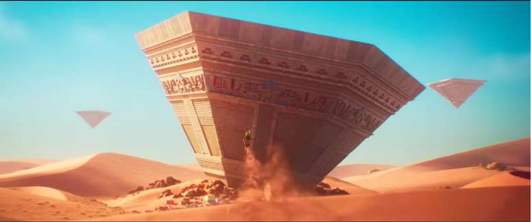 Ainda no início, o deserto ganha contornos familiares. A paisagem remete claramente ao Sand Kingdom de Super Mario Odyssey (2017), com direito à icônica pirâmide invertida de Tostarena ao fundo — elemento que já havia dado as caras em trailers anteriores. A presença do cenário reforça a proposta do filme de unir diferentes fases da franquia em um mesmo universo cinematográfico.