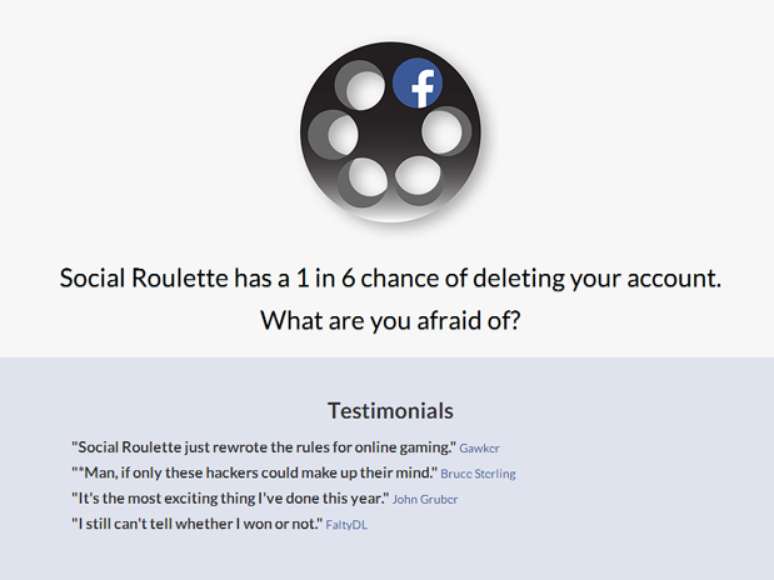 O site socialroulette.net tem apresentado uma nova forma de desafio online para os usuários do Facebook. No jogo, o internauta registra sua conta da rede social e tem uma em seis chances de ter seu perfil excluído do site de Mark Zuckerberg.