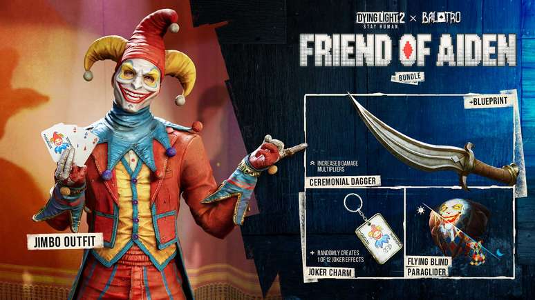 O Pacote Dying Light 2 x Balatro: Friend of Aiden oferece duas novas missões secundárias e itens gratuitos divertidos, entre eles o Joker Charm, que está em constante mudança similar a própria essência de azar e imprevisibilidade de Balatro. Sempre que você o equipa, um teste de sua própria sorte acontece, com seus efeitos sendo ativados aleatoriamente, trazendo a emoção característica de Balatro para Villedor.
