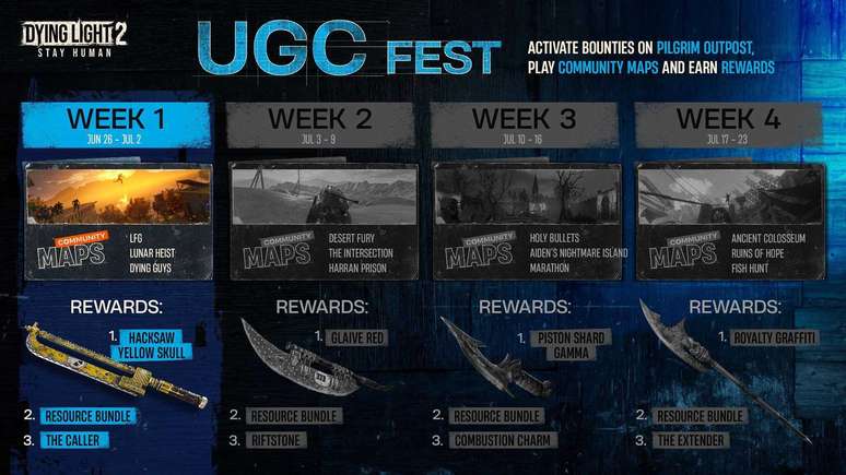 - Mapas criados pela comunidade: A cada semana, três novos mapas da comunidade ganham destaque, convidando os jogadores a explorar e vivenciar a criatividade da talentosa comunidade de Dying Light.
