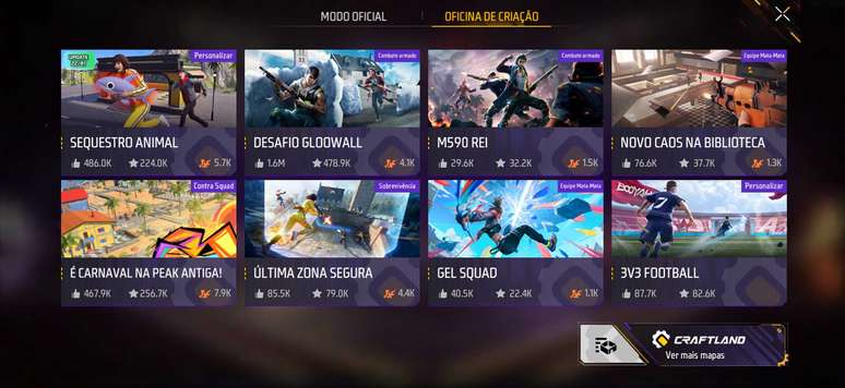 Reis do Bloco chega na Oficina de Criação, a plataforma criativa de Free Fire que permite aos jogadores criar e compartilhar seus próprios mapas, e promove o protagonismo, criatividade, além de fortalecer a conexão entre o jogo e a sua comunidade. Para acessar a novidade, os jogadores precisam alternar a guia do modo de jogo e clicar no botão Oficina de Criação, localizado no canto inferior direito da tela.
