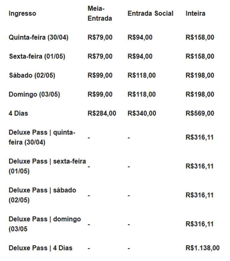 Os ingressos estarão disponíveis em diferentes categorias: Ingresso Diário, Deluxe Pass, 4 Dias e Deluxe Pass 4 Dias. Todas as entradas garantem acesso completo às áreas do evento abertas ao público.